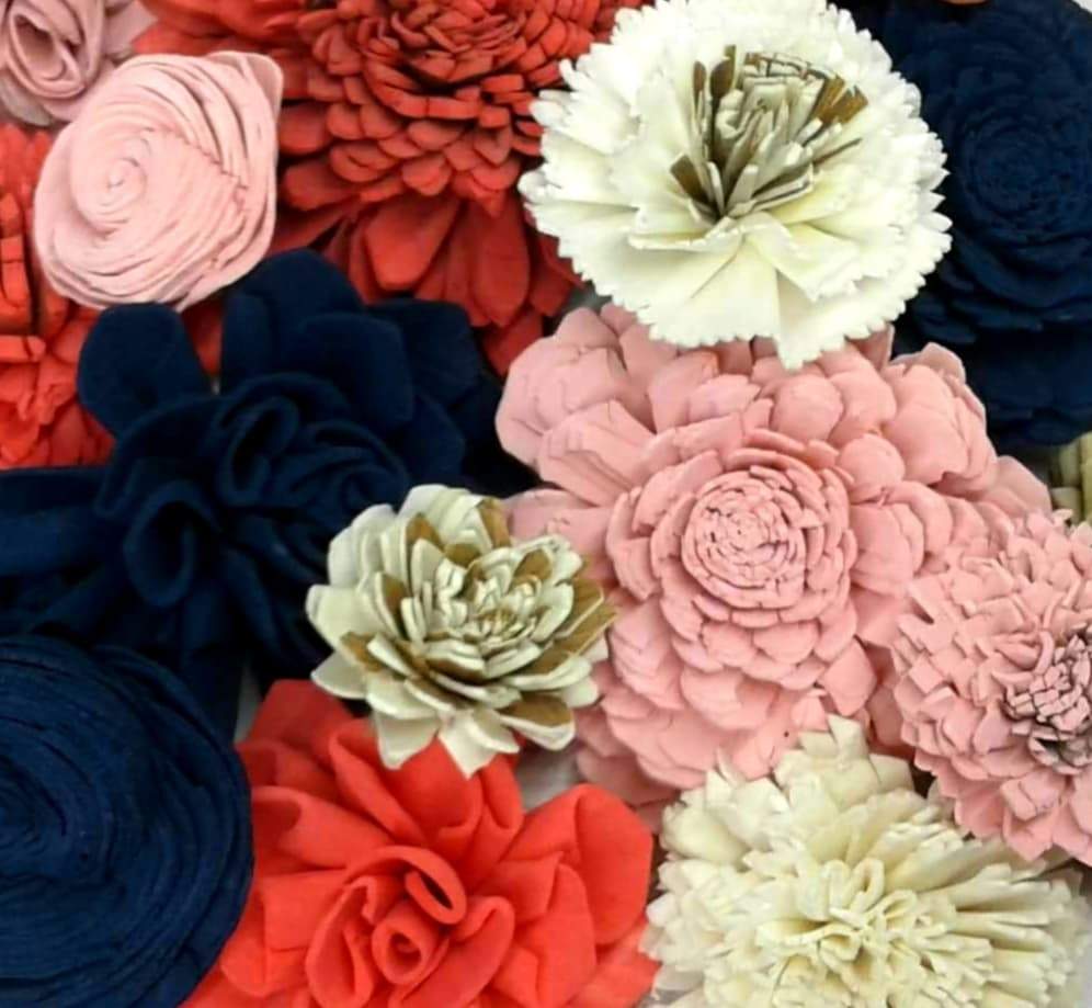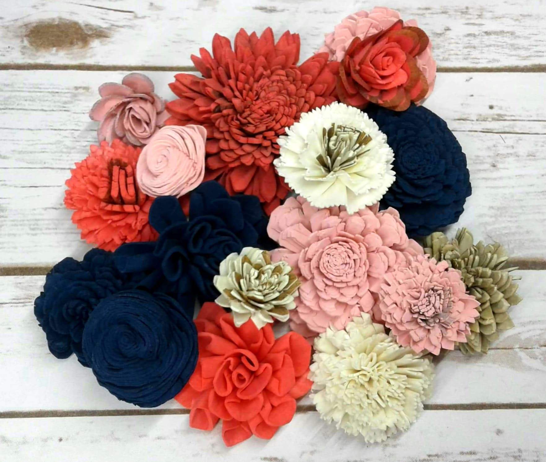 Check out this BEAUTIFUL wood flower colored assortment! With a Variety of Flowers ranging in sizes 1"-4".Make sure you pick if you would like raw flowers added to the colors in the assortment or no raw flowers.