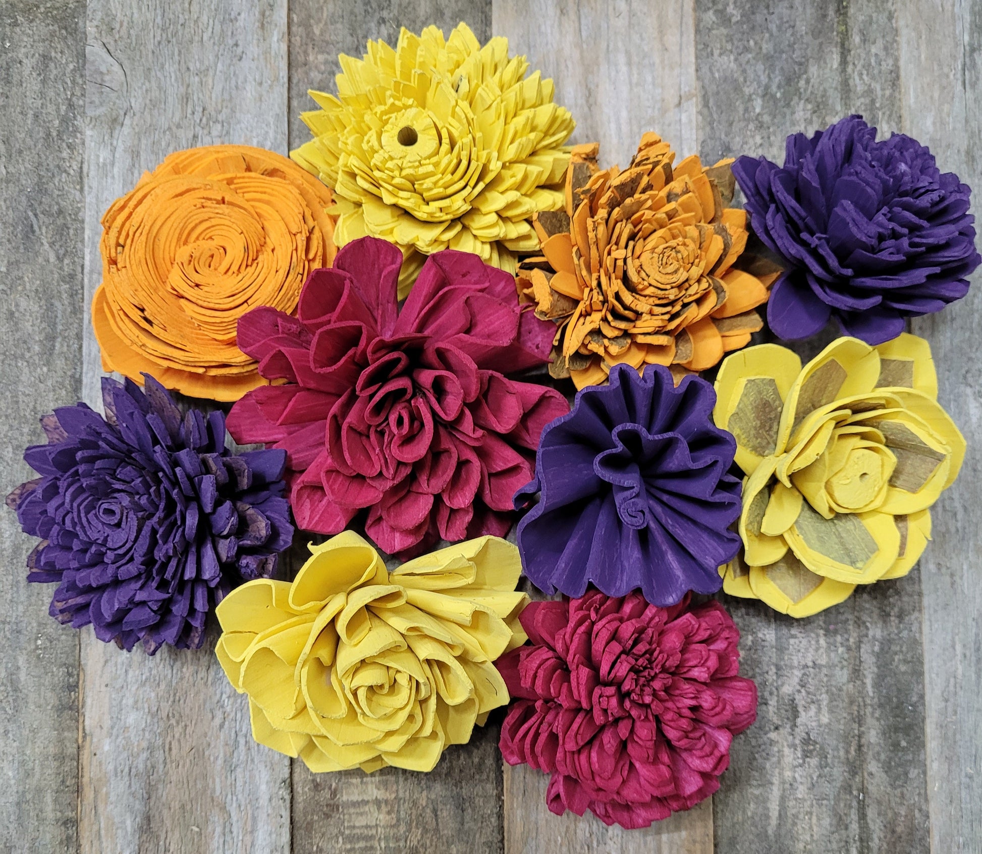 Check out this BEAUTIFUL wood flower colored assortment! With a Variety of Flowers ranging in sizes 1"-4".Make sure you pick if you would like raw flowers added to the colors in the assortment or no raw flowers.