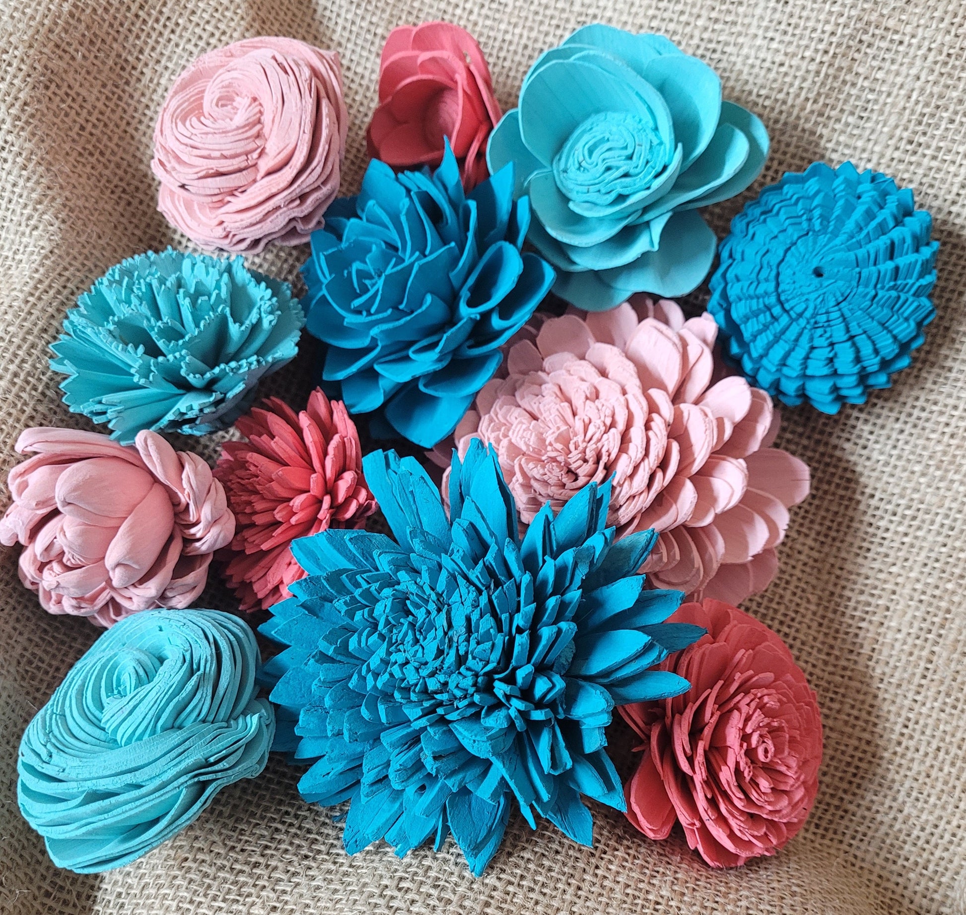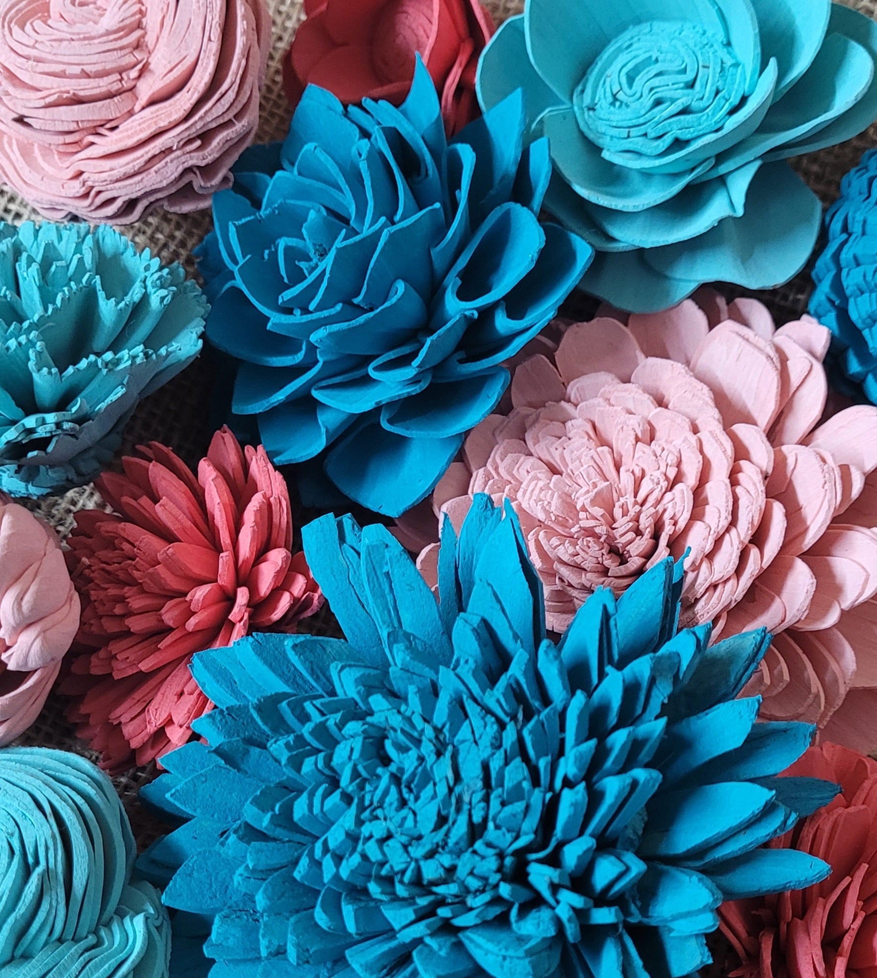 Check out this BEAUTIFUL wood flower colored assortment! With a Variety of Flowers ranging in sizes 1"-4".Make sure you pick if you would like raw flowers added to the colors in the assortment or no raw flowers.