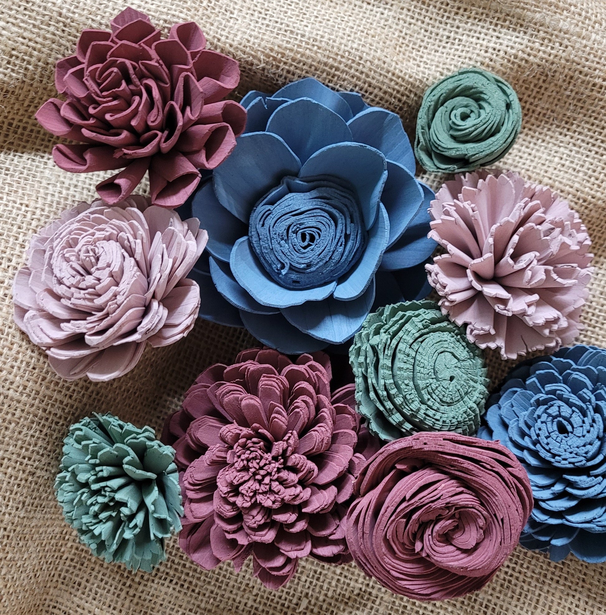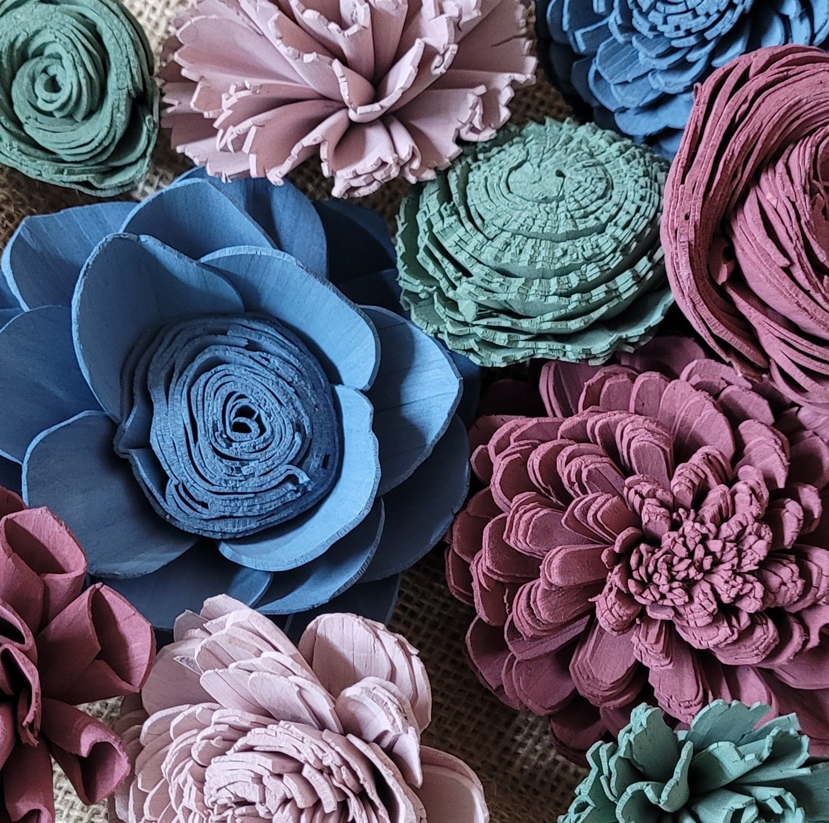 Check out this BEAUTIFUL wood flower colored assortment! With a Variety of Flowers ranging in sizes 1"-4".Make sure you pick if you would like raw flowers added to the colors in the assortment or no raw flowers.