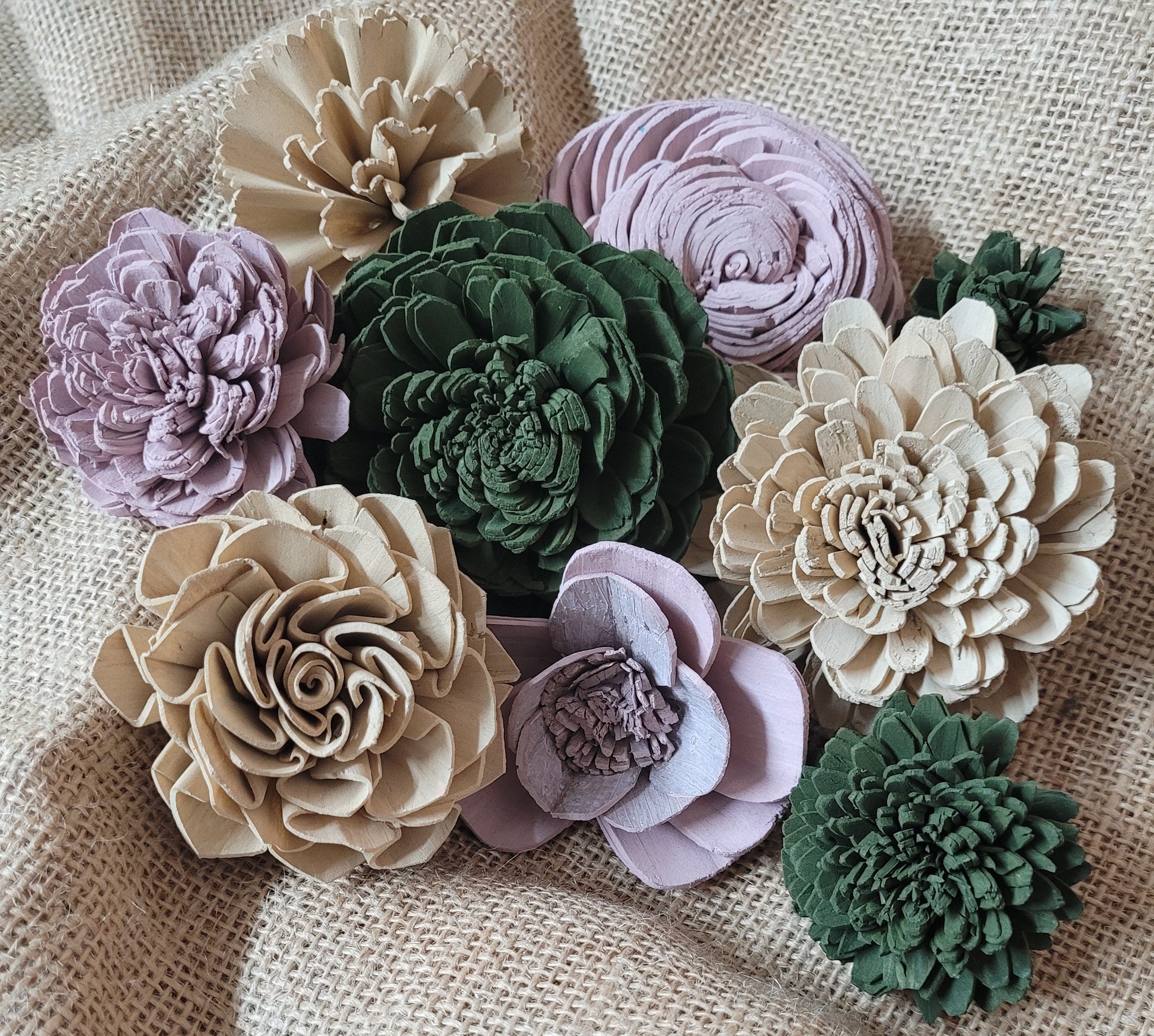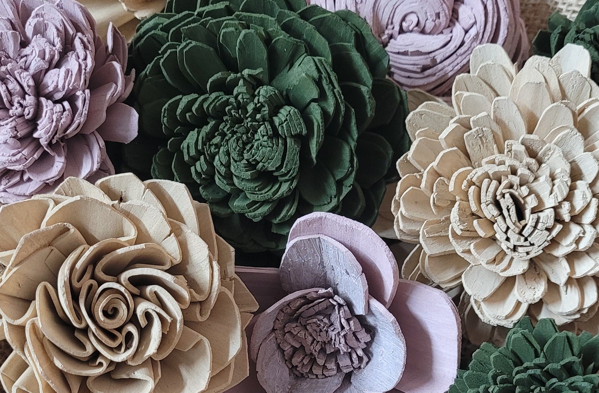 Check out this BEAUTIFUL wood flower colored assortment! With a Variety of Flowers ranging in sizes 1"-4".Make sure you pick if you would like raw flowers added to the colors in the assortment or no raw flowers.