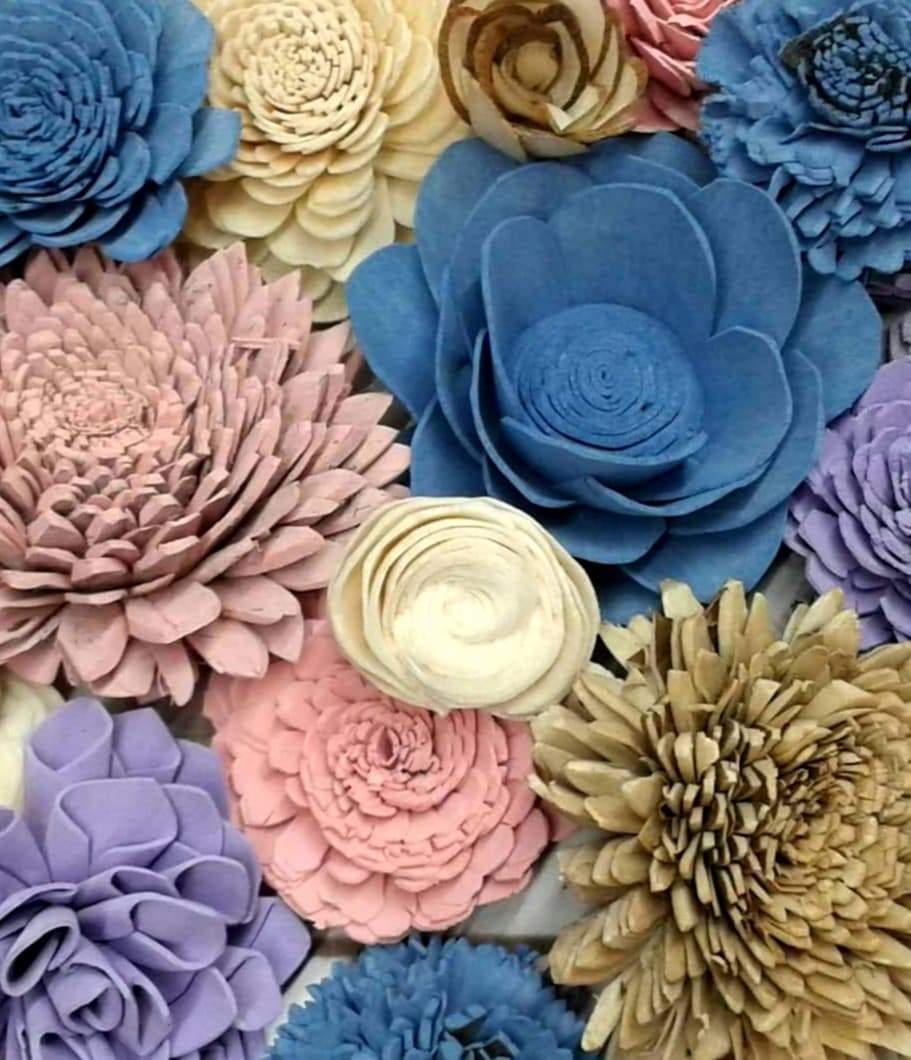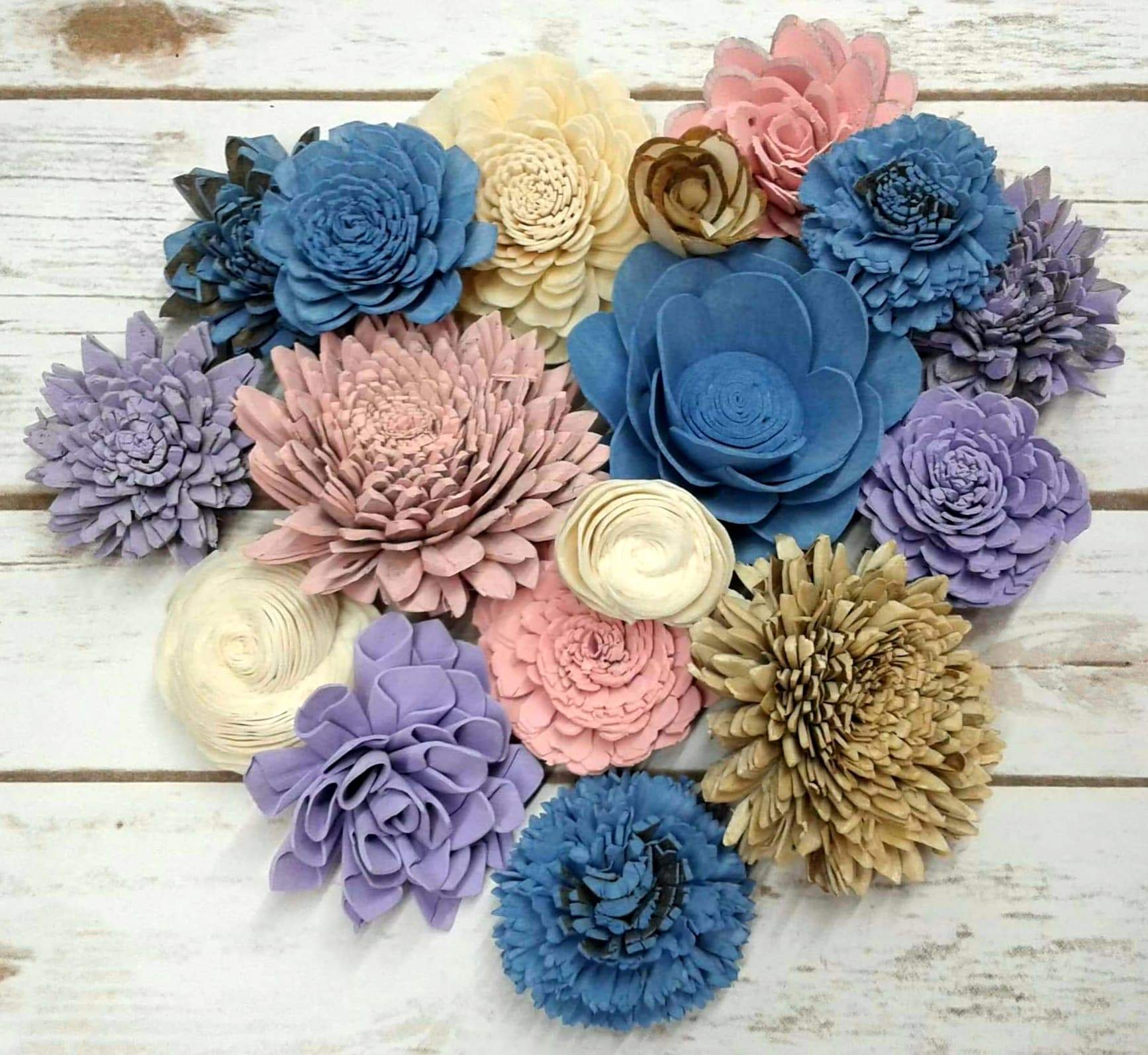 Check out this BEAUTIFUL wood flower colored assortment! With a Variety of Flowers ranging in sizes 1"-4".Make sure you pick if you would like raw flowers added to the colors in the assortment or no raw flowers.