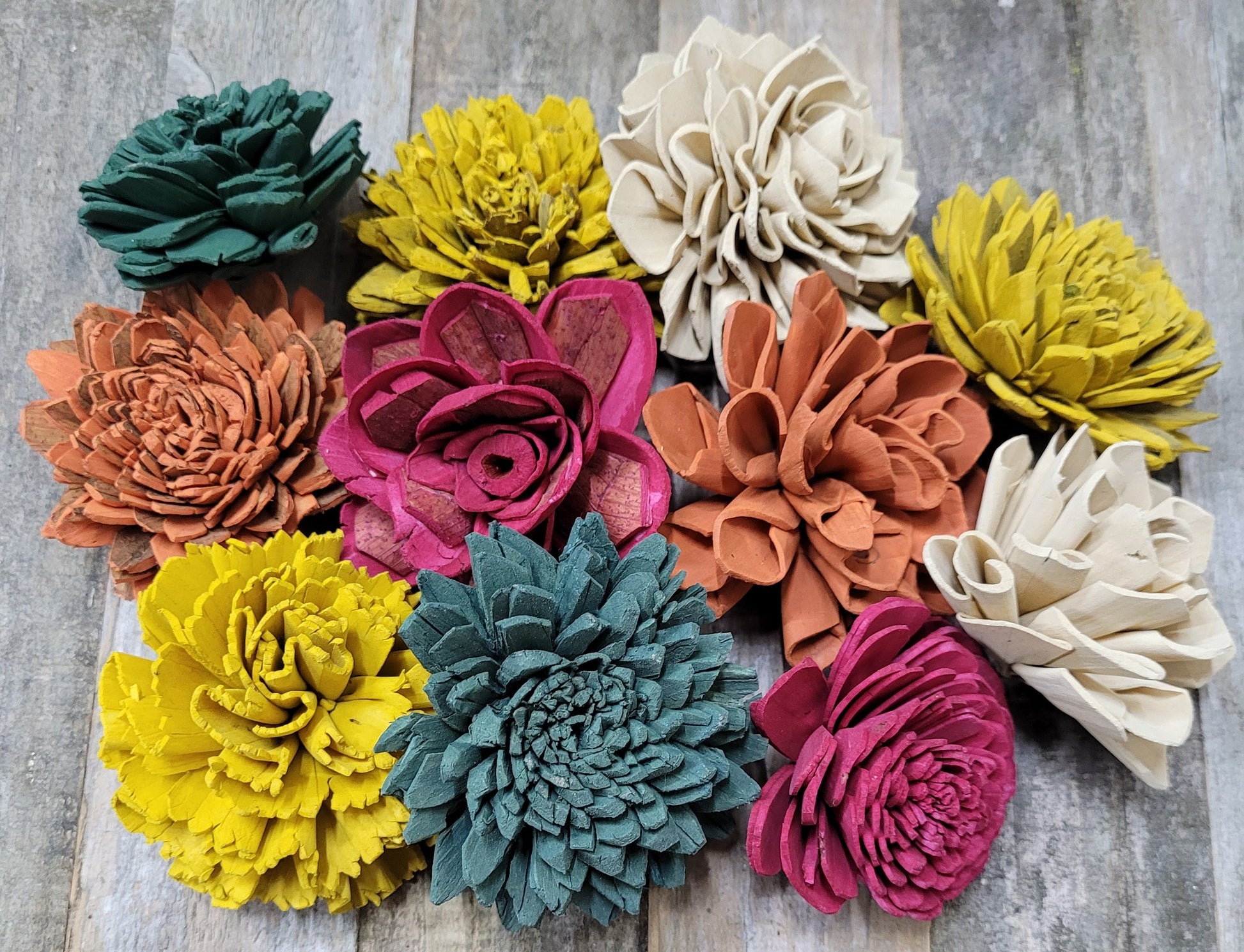 Check out this BEAUTIFUL wood flower colored assortment! With a Variety of Flowers ranging in sizes 1"-4".Make sure you pick if you would like raw flowers added to the colors in the assortment or no raw flowers.