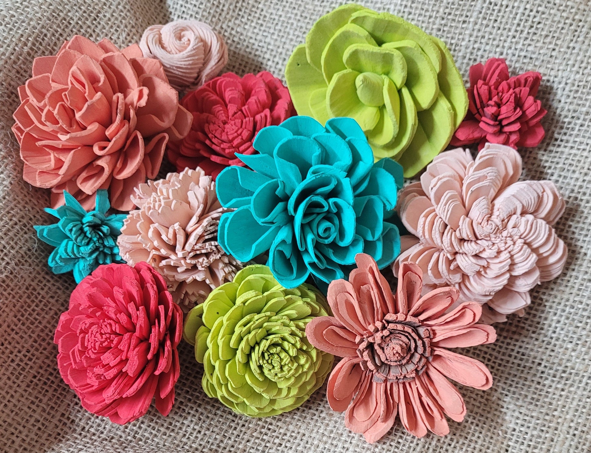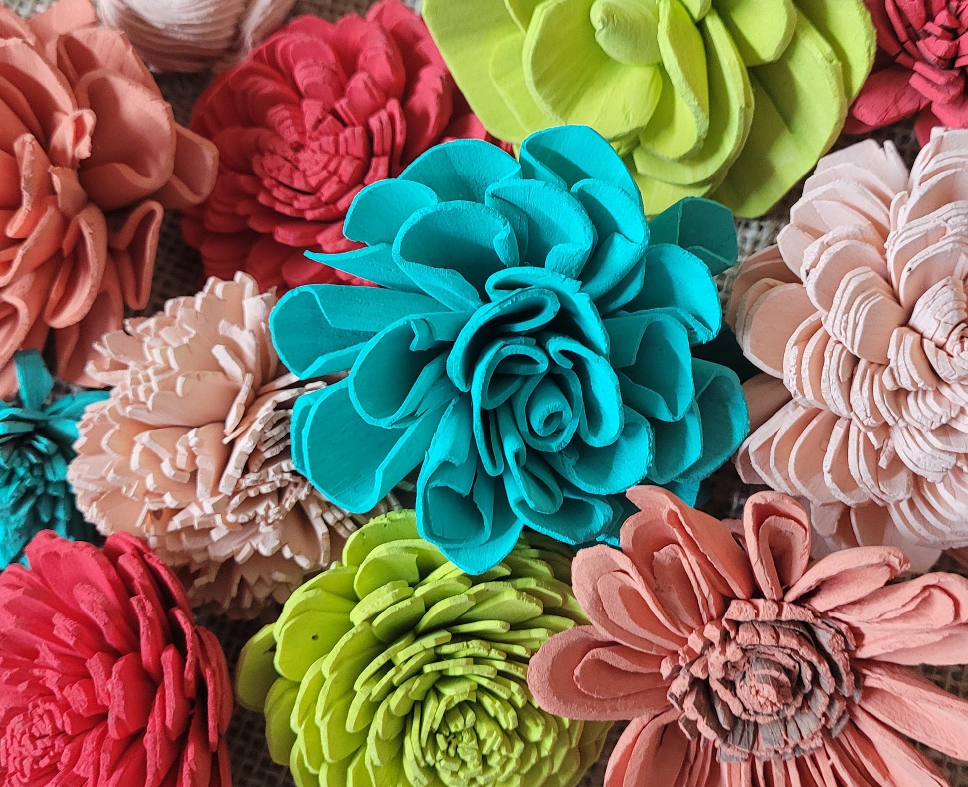 Check out this BEAUTIFUL wood flower colored assortment! With a Variety of Flowers ranging in sizes 1"-4".Make sure you pick if you would like raw flowers added to the colors in the assortment or no raw flowers.