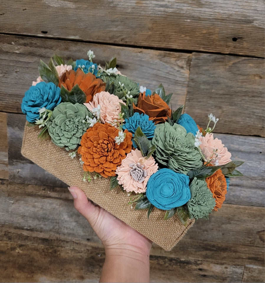 Check out this beautiful wood flower arrangement! This arrangement is made in a 9" wood box wrapped in burlap, due to the flowers sticking over the edge, the arrangement will be slightly larger.