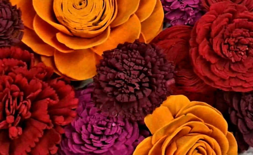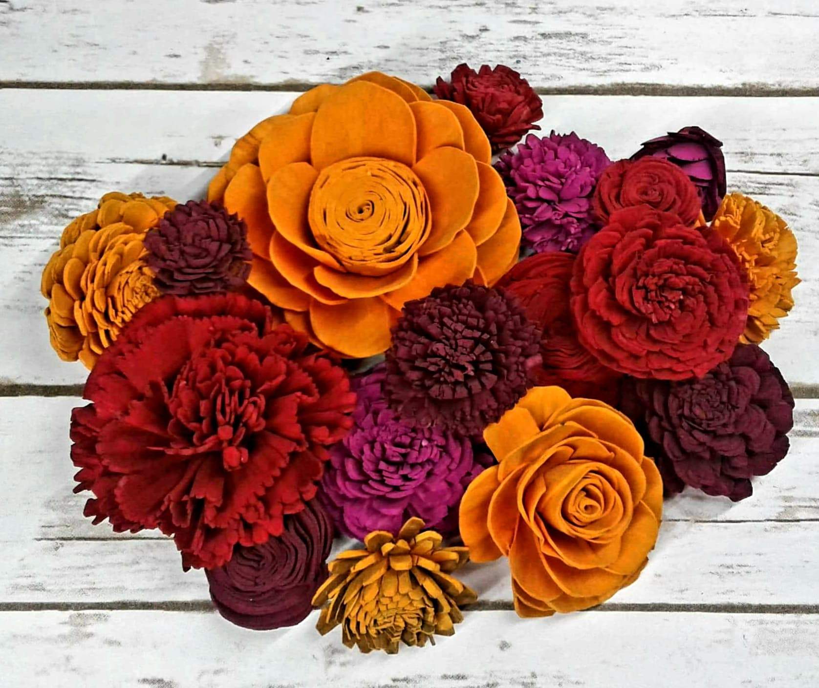 Check out this BEAUTIFUL wood flower colored assortment! With a Variety of Flowers ranging in sizes 1"-4".Make sure you pick if you would like raw flowers added to the colors in the assortment or no raw flowers.