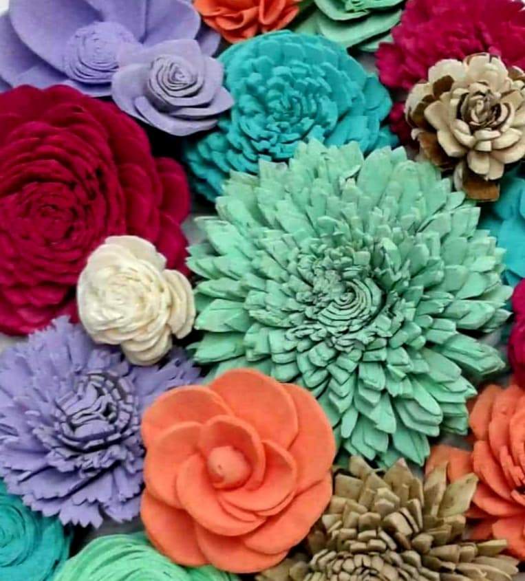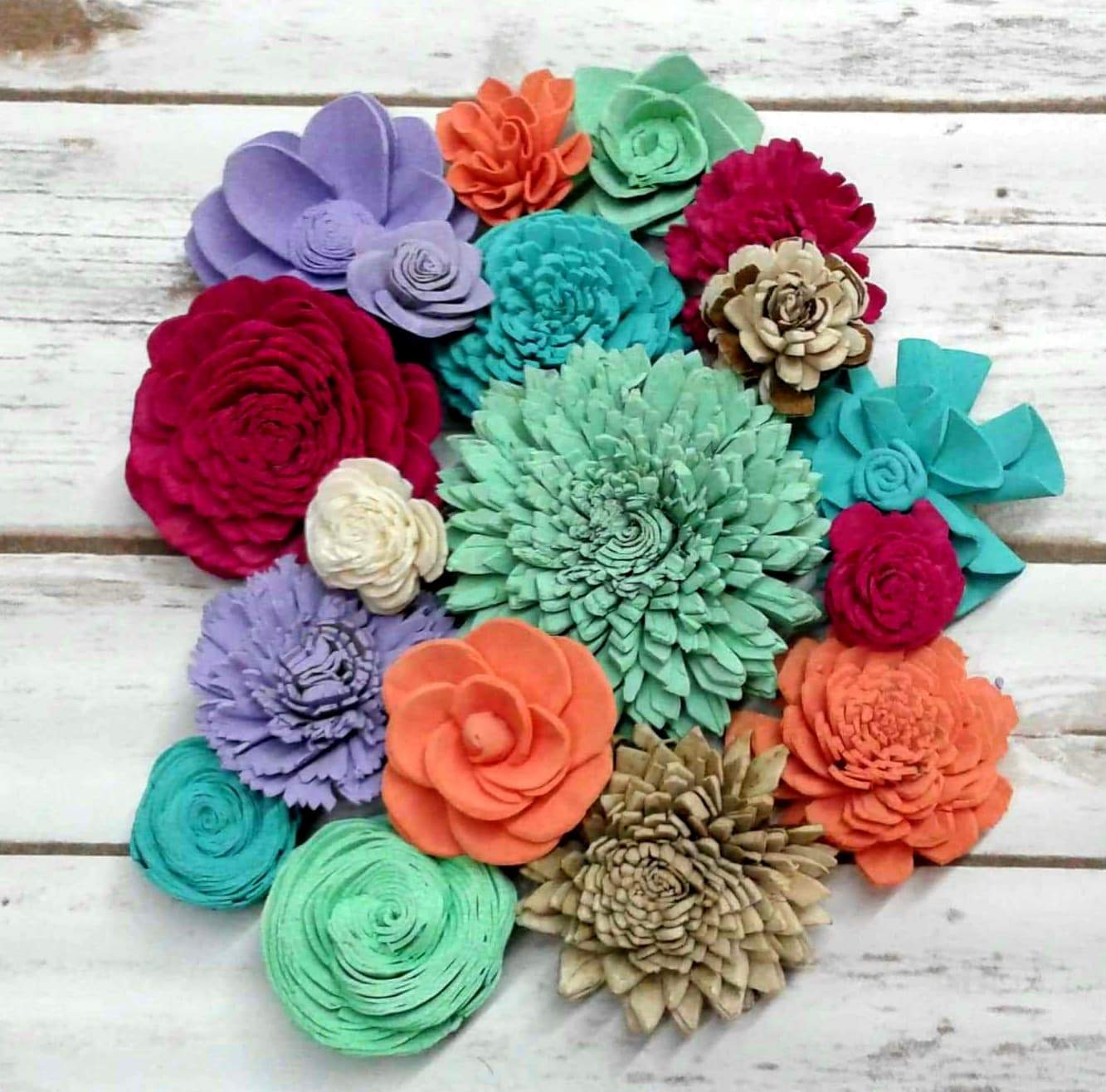 Check out this BEAUTIFUL wood flower colored assortment! With a Variety of Flowers ranging in sizes 1"-4".Make sure you pick if you would like raw flowers added to the colors in the assortment or no raw flowers.