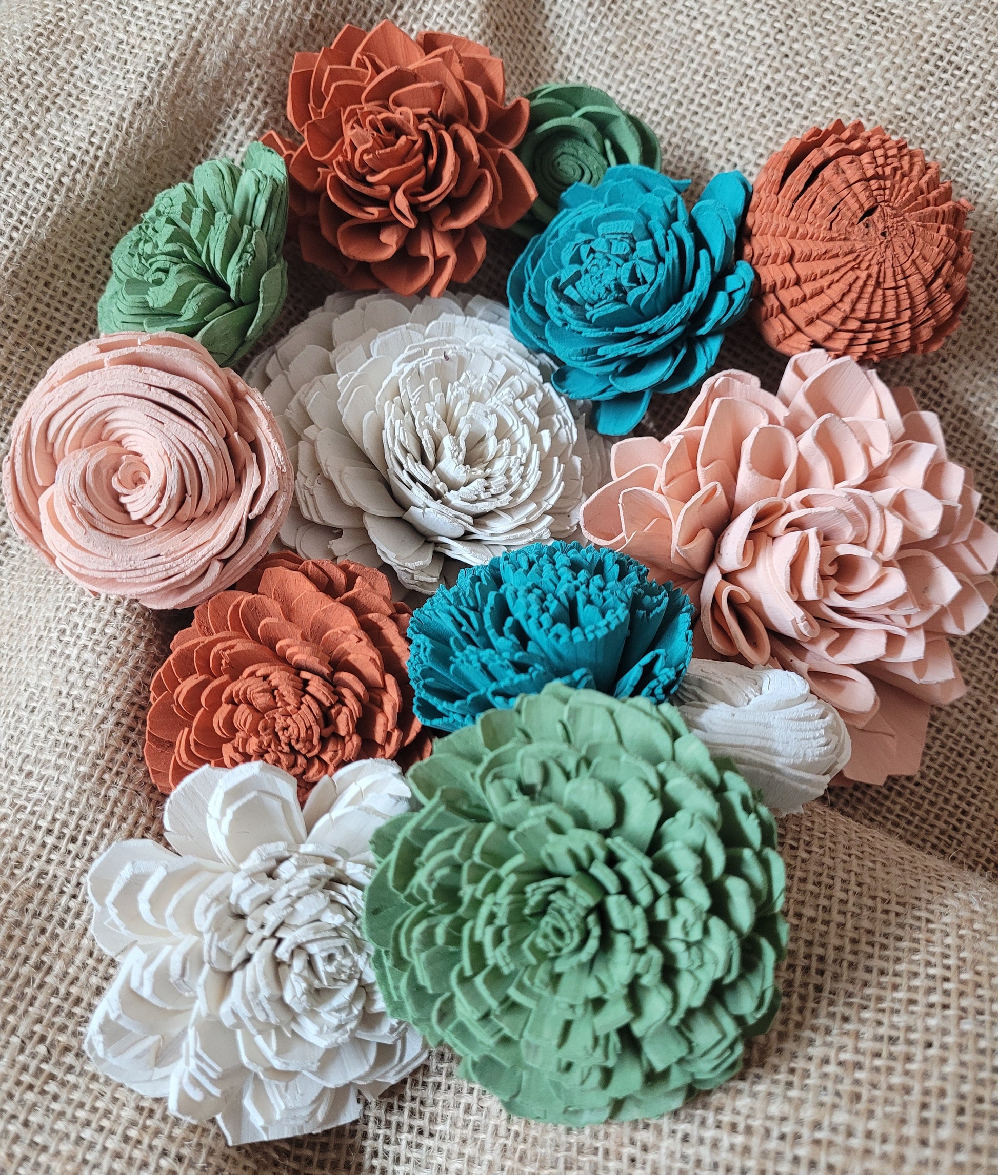 Check out this BEAUTIFUL wood flower colored assortment! With a Variety of Flowers ranging in sizes 1"-4".Make sure you pick if you would like raw flowers added to the colors in the assortment or no raw flowers.